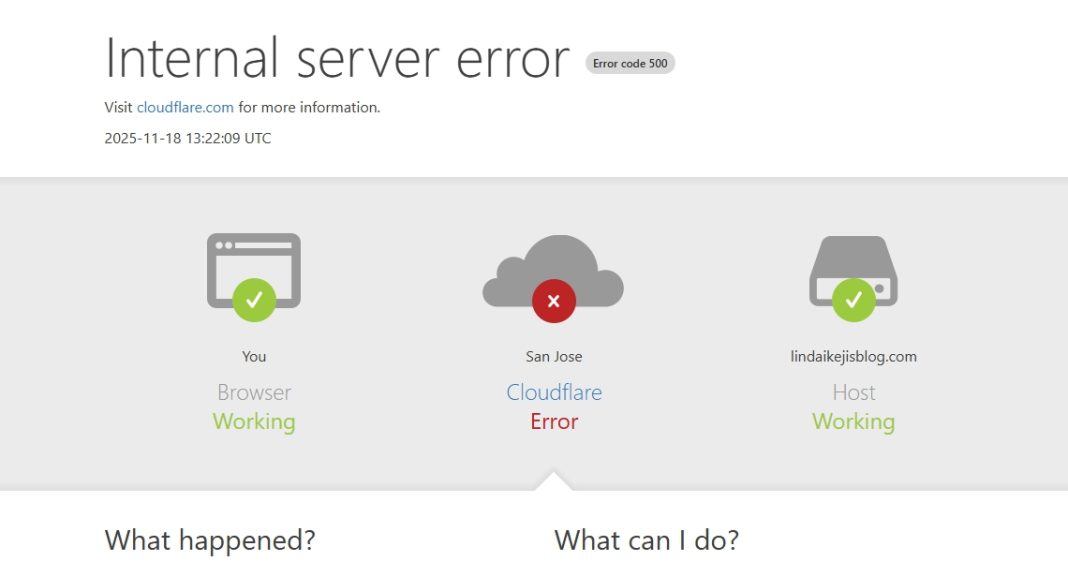 • What caused this has been blamed on the Cloudflare: Cloudflare acknowledged the system-wide disruption, citing “Widespread 500 errors” and failures across its Dashboard and API. A 500 error indicates a generic internal server issue preventing access.